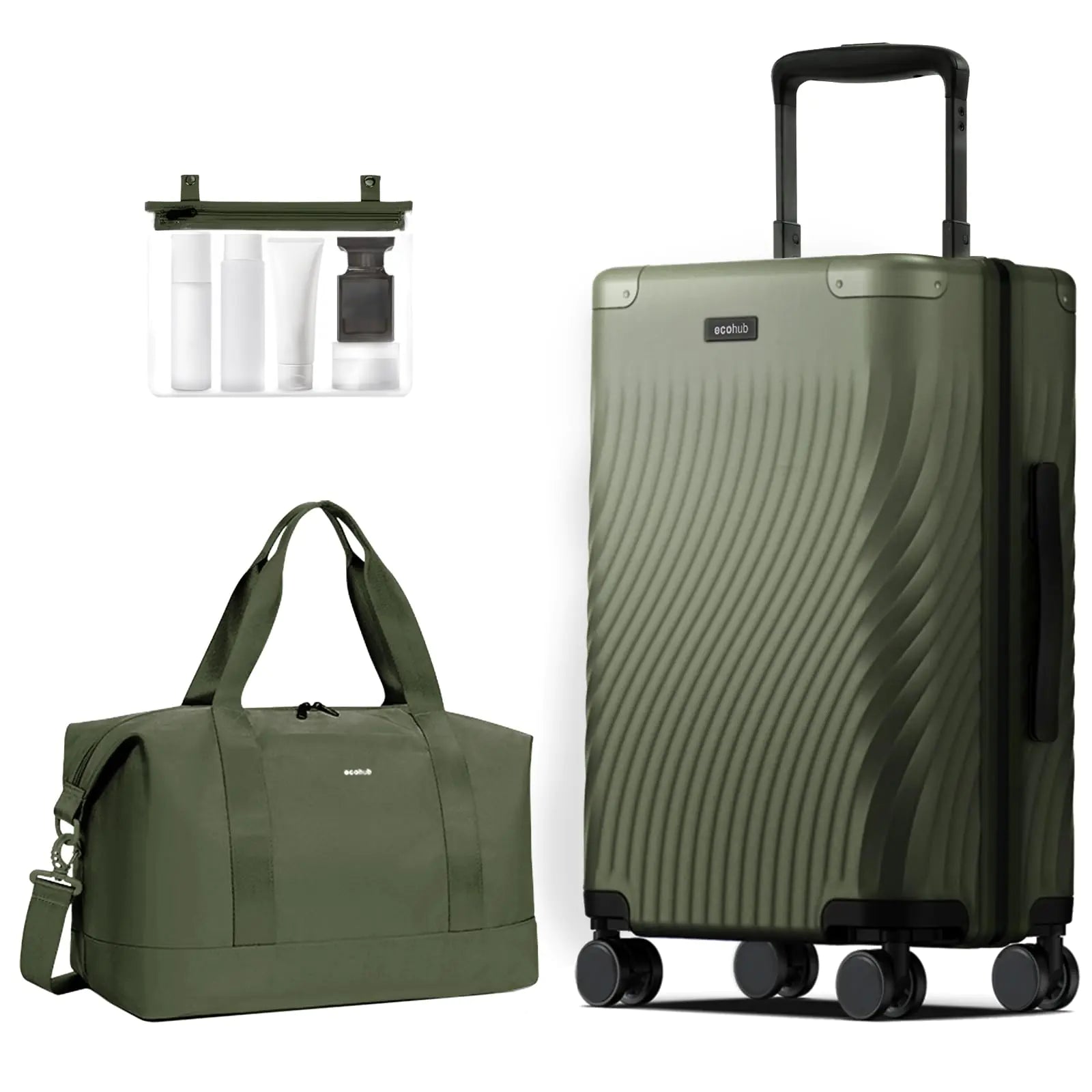 [【Lightweight & 400% Impact-Resistant】: This luggage weighs ONLY 7.49lbs. Our carry-on luggage features Bayer polycarbonate for superior durability resisting cracks and deformations. 4 aluminum alloy corner protectors handle impacts and drops during transport while the reinforced 4-stage aluminum telescopic handle is lightweight corrosion-resistant and robust. Travel with confidence—enjoy your journey and we’ll deliver the quality. (PATENT PENDING) 【Expandable & Durable】: Expands from 9 to 11.3 inches (45L to 57L) this Spinner Luggage offering up to 26% more packing space while meeting most domestic carry-on requirements. Equipped with steel axle TPE spinner wheels it ensures smooth and effortless rolling over uneven surfaces. The expansion compartment is crafted from 1280D tear-resistant nylon with smooth YKK zippers providing a durable and reliable travel experience. 【Dual Full-Closure Compartments】: Two fully enclosed compartments with zippered closures prevent shifting keeping your belongings secure and wrinkle-free during travel. Includes a wet zippered pocket and mesh pocket for flexible storage ensuring organized packing. Plus a TSA-approved lock allows airport security inspections without damage ensuring peace of mind and hassle-free travel. 【Shop More Pack Easy】: Includes Free Foldable Duffel for Extra Space! The ECOHUB travel bag we’ve included offers a spacious 30L main compartment and a leak-proof exterior zipper pocket perfect for toiletries or wet items during quick security checks. When not in use simply fold the bag into the transparent wet pocket for easy carrying. Found a gift or souvenir? No need to buy an extra bag—our free foldable duffel has you covered! 【Sustainable & Guaranteed】: The ECOHUB small carry-on suitcase is made from 60% recycled PC cover and 100% recycled lining reflecting our commitment to sustainability. It features durable side carry handles and reinforced ripstop stitching. Equipped with side hooks it allows you to free your hands by easily attaching accessories or hanging items. This is our first luggage series backed by a 3-year limited warranty. We hope you enjoy it as much as we do.(PATENT PENDING)]