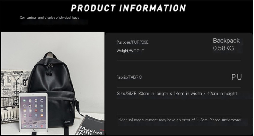 Please note that due to different monitors and lighting effects, the actual color of the backpack may vary slightly from the images. Additionally, allow for a 2-3 cm difference in size due to manual measurement.